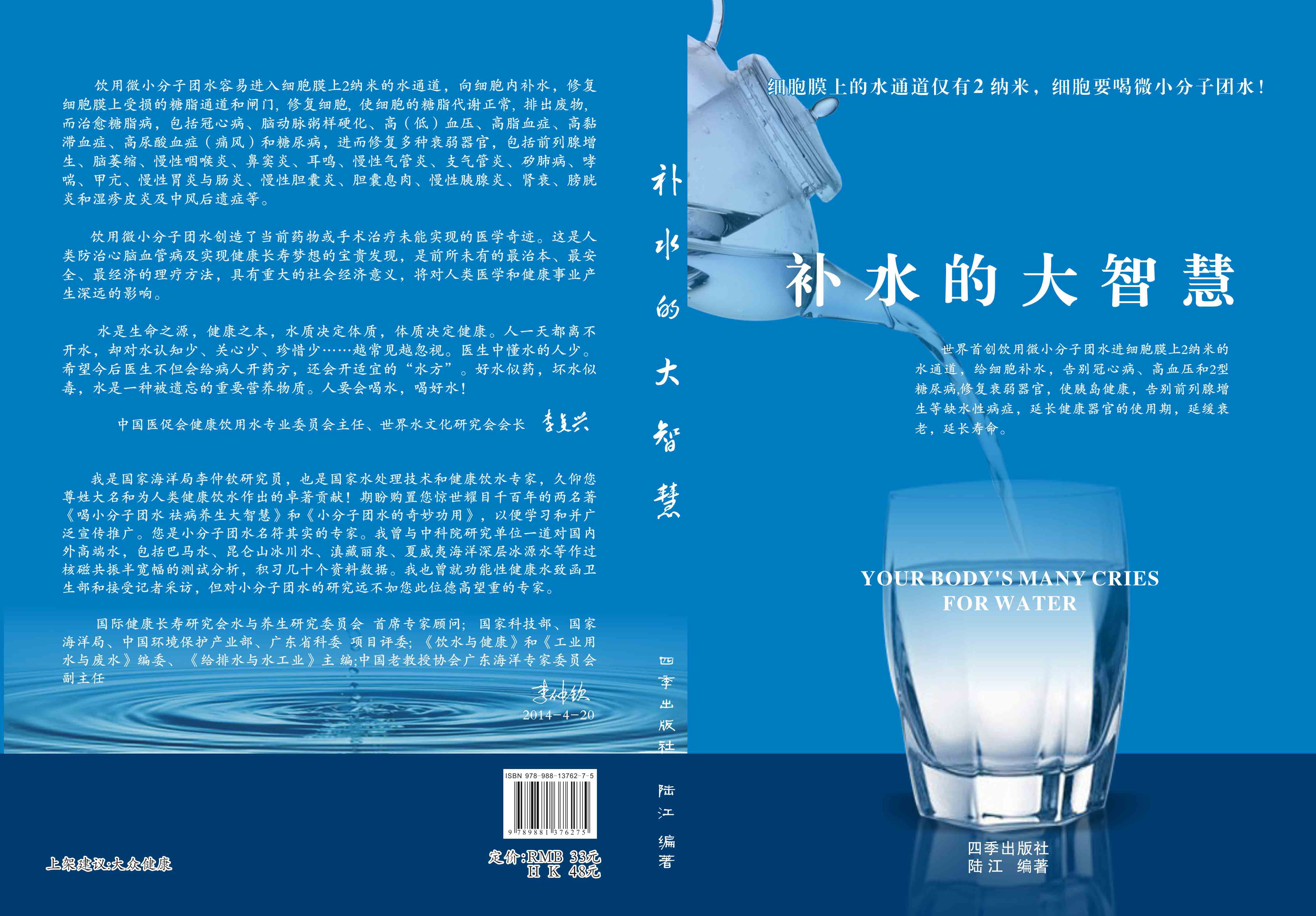 ----幾千年來,人們感到口渴才喝水,誤認為口渴是唯一的缺水信號,使喝水量偏少。很多人只知道補血補氣補腎補鈣補硒,而不知補水,逐漸使許多器官缺水,包括皮膚、動脈、氣管、膽囊、腸胃、骨關節(jié)、腎臟、前列腺和胰島缺水,以致患冠心病、高(低)血壓和糖尿病等缺水性病癥。美國F·巴特曼醫(yī)學博士寫有《水是最好的藥》一書很受歡迎,我國2007年譯成中文版,論述人體缺水引起許多病癥,他指導3000多患者喝水治愈了哮喘、胃炎和高血壓等病癥。而我是從2000年起,讓患者飲用微小分子團水,因為容易進細胞膜上2納米的水通道,治愈了許多缺水性的病。我跟蹤調查14年,發(fā)現(xiàn)凡是認真飲用和合理膳食,可治愈冠心病、高(低)血壓和2型糖尿病與衰弱器官并發(fā)癥及中風后遺癥。高血壓患者飲用2~5個月,癥狀消除,不再服藥,逐漸逆轉至消除動脈粥樣硬化,血壓正常穩(wěn)定,治愈了高血壓;冠心病人飲用3~5個月,消除心絞痛、房顫等癥狀,不再服藥,一年左右心電圖正常,經(jīng)冠狀動脈造影掃描表明冠脈內(nèi)無粥樣斑塊,真正治愈了冠心病;2型糖尿病人飲用3~10個月停藥,血糖尿糖正常,糖尿病痊愈。并且使前列腺增生、慢性咽喉炎、鼻竇炎、耳鳴、慢性氣管炎、支氣管炎、哮喘、矽肺病、慢性胃腸炎、膽囊炎、胰腺炎、腎衰、膀胱炎、風濕性關節(jié)炎、便秘、痔瘡和濕疹皮炎等不藥而愈,而無需終生服藥。飲用微小分子團水治愈的是長期吃藥治不好的病,彌補了幾千年來醫(yī)藥的欠缺,成為人類健康的寶貴資源。
